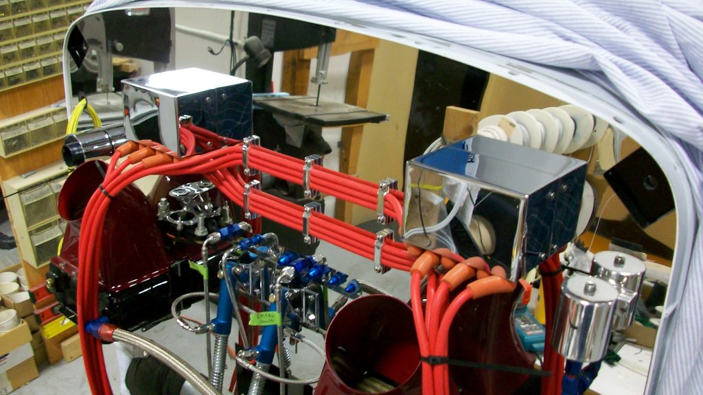 Although the fit was very good, it wasn’t good enough for Ron. After that we made small square pieces with holes drilled up and reamed to final undersized dimensions. Using Click-Bond adhesive we bolted each of the squares in place until cured. The end result was a template with each and every hold perfectly press fit to match the mounting holes on the firewall. After that, Ron used the template to match each hole in the stainless sheet with a large selection of Cobalt drill bits that were tossed as soon as they showed any signs of dulling.