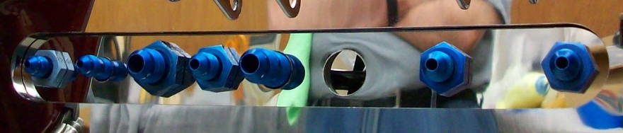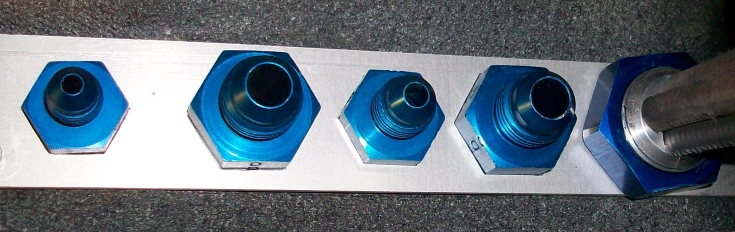 The fittings were inserted from the aft side of the firewall and we fabricated a plate with corresponding hex patterns cut out to prevent rotating of the fitting while tightening and loosening of the lines attached to the fittings. This not only prevented damage to the fitting and the firewall from large lock washers, but allowed for installing the fittings with the least amount of thickness to tighten against. This was important because after securing the fittings with the appropriate nuts on the forward side we put a prefit piece of polished stainless over the securing nut and held the stainless piece on with an additional nut for cosmetic reasons.