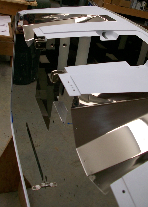As you can see in the picture, the flange that is exposed beyond the sheet metal is top coat painted and taped off for protection. The engine mount anchor points are painted as well. The nose wheel well and exhaust tunnels already went through this same process to bond the mirror finished stainless sheet metal there as well. I’ll cover that in a seperate post.